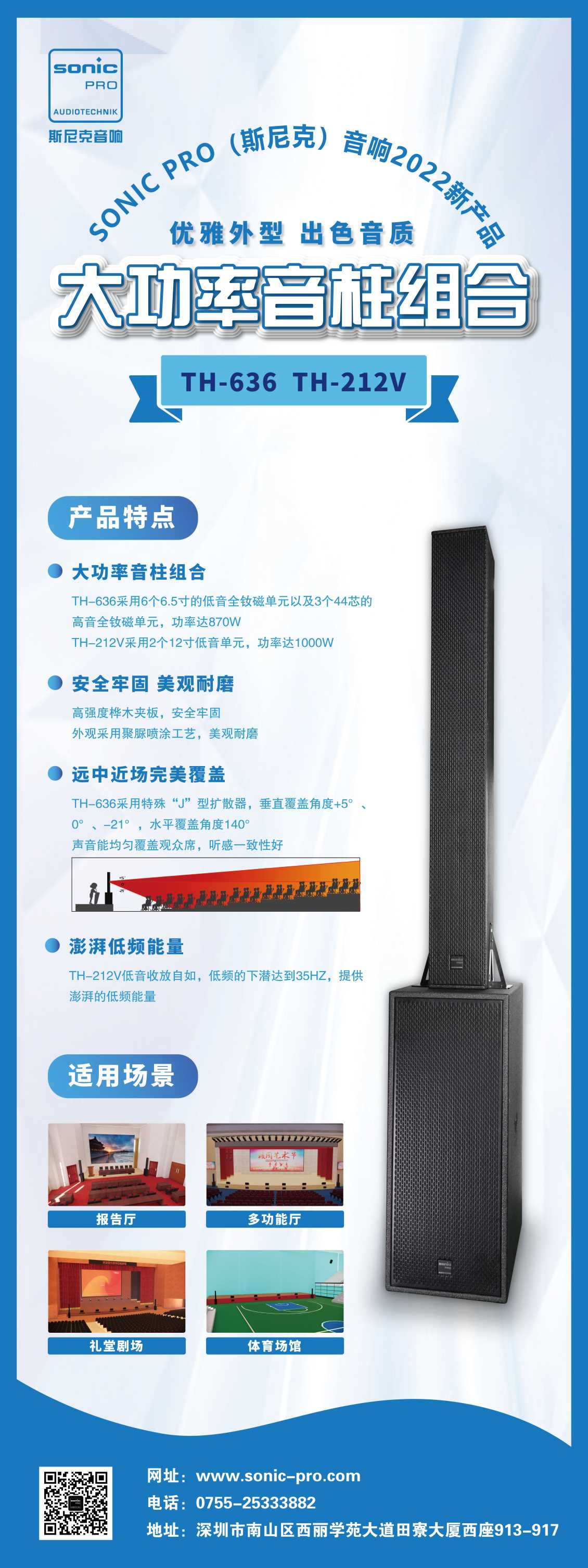 大功率音柱组合,应用于报告厅、多功能厅、礼堂剧院、体育馆等场合;具有优雅的外形,出色的音质。